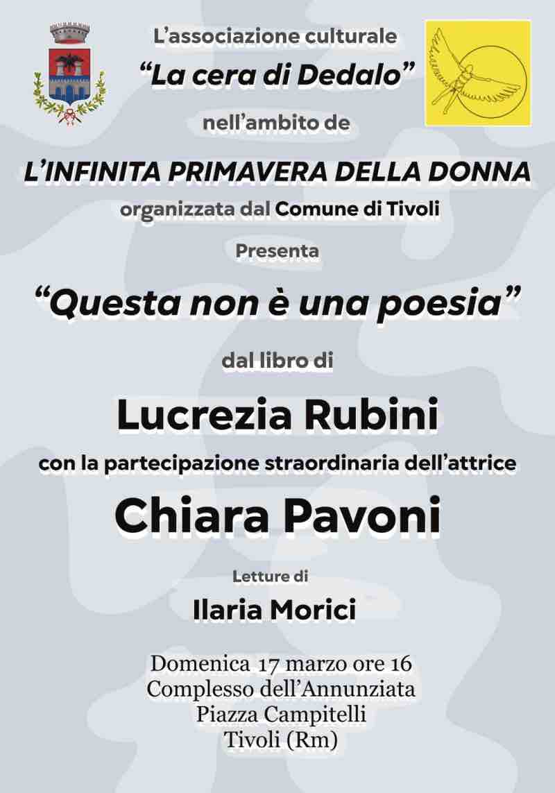 Si terrà domenica prossima a Tivoli un appuntamento culturale ad ingresso libero inserito nel ciclo “L’Eterna Primavera della Donna” promosso dal Comune di Tivoli in collaborazione con l’associazione culturale “La cera di Dedalo”, presieduta dall’architetto Giorgio La Bianca. L’evento sarà dedicato al libro intitolato “Questa non è una poesia” di Lucrezia Rubini, con la lettura interpretata dell’autrice insieme all’attrice e performer Chiara Pavoni, con l’intervento della studentessa Ilaria Morini, già allieva della professoressa Rubini presso il Liceo Artistico di Tivoli P.E. Adriano. Monolite Notizie ha approfondito i temi del libro di Lucrezia Rubini in occasione di un’altra iniziativa a Roma di cui qui il link all’articolo uscito a novembre 2023, accompagnato da video-servizio che si può vedere qui.