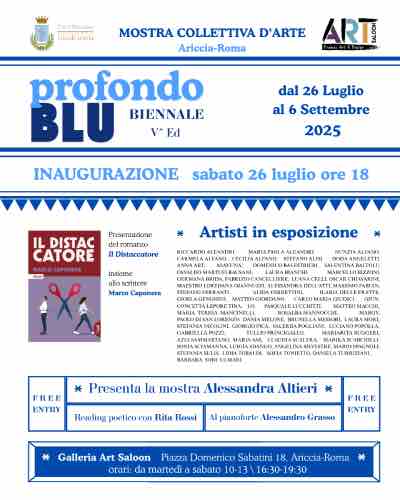 Il colore della profondità, del sogno e della memoria è tornato protagonista nella cornice elegante e vibrante della Galleria Art Saloon di Ariccia, gestita da Alessandra Altieri, che ospita fino al 6 settembre la quinta edizione della mostra collettiva “Profondo Blu”. Inaugurata lo scorso 26 luglio, la quinta edizione della Biennale, realizzata con il patrocinio del Comune di Ariccia, è ormai diventata un punto di riferimento nel panorama artistico laziale e nazionale, capace di richiamare pubblico, critici e artisti da ogni angolo d’Italia.