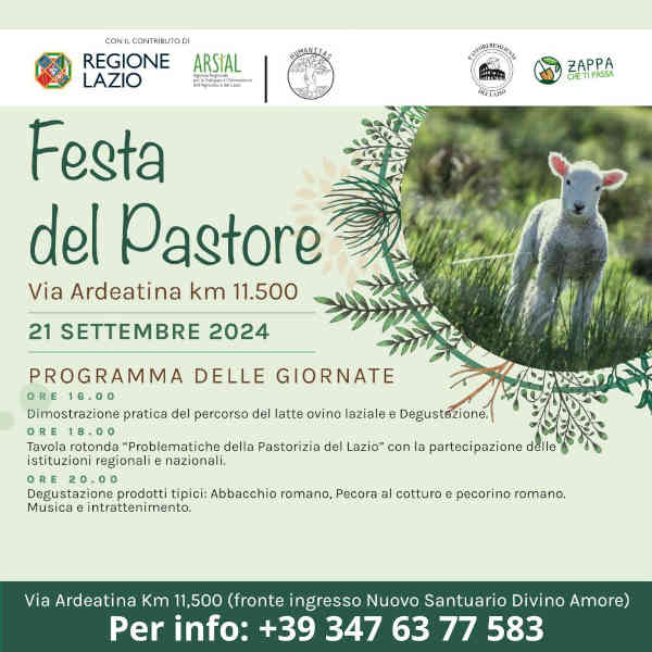 Sono questi alcuni principi ispiratori della Festa del Pastore, promossa dall’Associazione Humanitas con il contributo di Arsial e della Regione Lazio, che si terrà sabato 21 Settembre, dalle ore 16:00 e per tutta la serata, presso l’area Zappa che ti passa di fronte al Nuovo Santuario del Divino Amore, in via Ardeatina km 11,500.