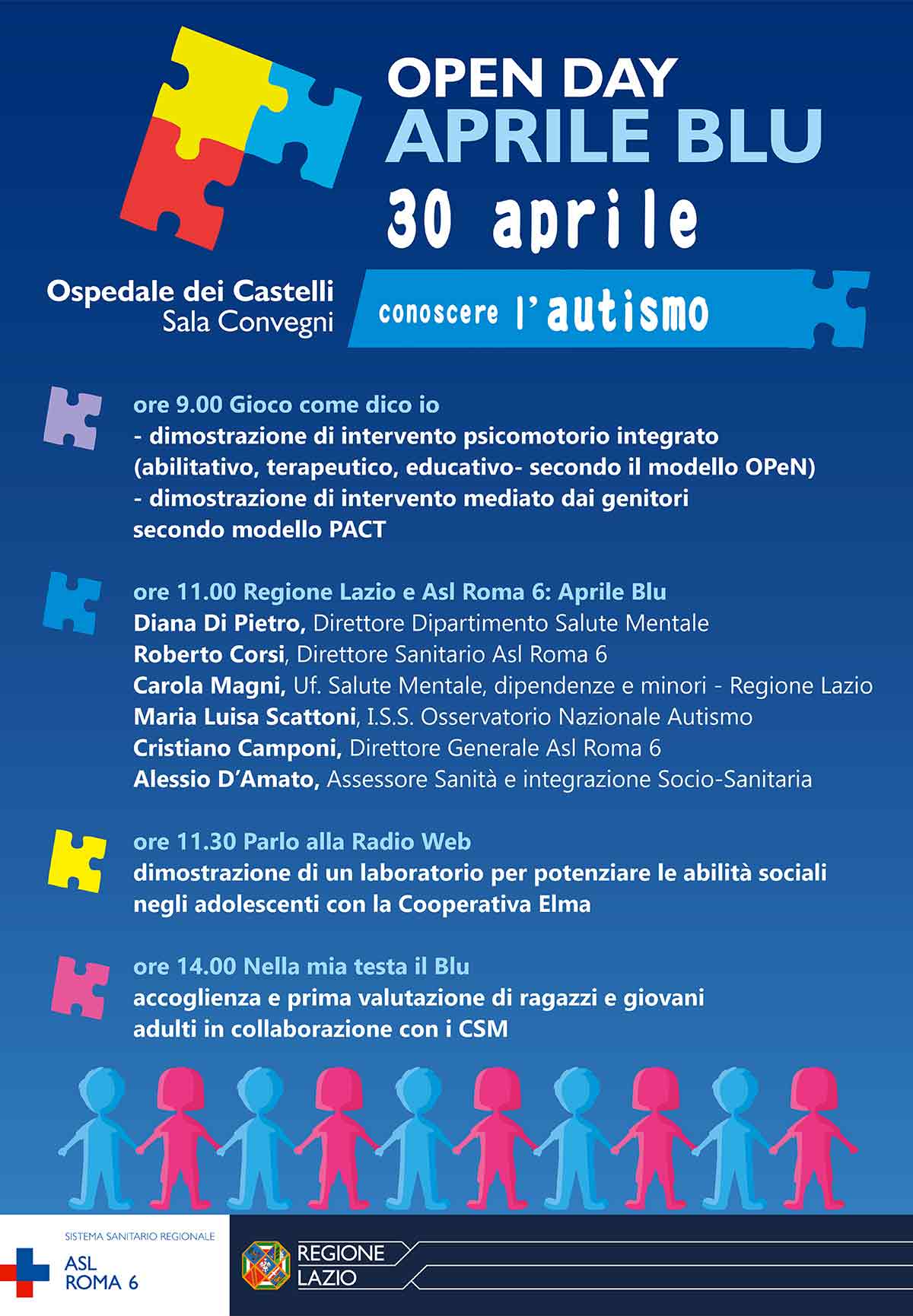 Sabato 30 aprile dalle 9.00 alle 16.00 presso l’Ospedale dei Castelli si svolgerà la giornata conclusiva dell’iniziativa di sensibilizzazione sul tema dell’autismo denominata “Aprile blu”, apertasi sabato 2 aprile in occasione della “Giornata Mondiale di consapevolezza sull’autismo” e proseguita con gli appuntamenti del sabato presso i Centri TMSREE (Tutela Salute Mentale e Riabilitazione dell’Età evolutiva) della Asl Roma 6.