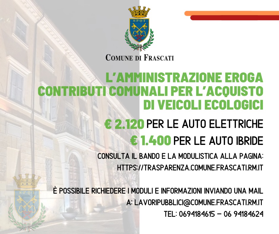 Fino al 1° marzo 2021 è possibile richiedere contributi comunali per l’acquisto di veicoli ecologici. L’Amministrazione comunale ha infatti riaperto i termini per la richiesta di contributi economici a copertura parziale delle spese di acquisto delle vetture. È possibile ottenere per ogni auto elettrica € 2.120; mentre ogni auto ibrida € 1.400. I contributi sono cumulabili con gli altri incentivi statali e regionali. Il bando e la modulistica sono consultabili alla pagina: https://trasparenza.comune.frascati.rm.it/index.php?id_oggetto=11&id_doc_=497397