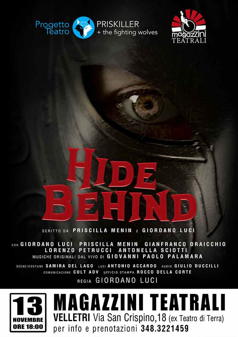 Hide Behind è il Dio venerato da una piccola comunità̀, che osserva questo culto tramandato di generazione in generazione. I suoi membri seguono pedissequamente regole molto rigide, prima fra tutte il divieto assoluto di voltarsi indietro – pena l’esilio, violenza psicologica e punizioni corporali. Il gran sacerdote – fanatico e cattivo – vuole attuare la teocrazia senza scrupoli. Il suo animo è tormentato da “demoni oscuri” che egli riesce a controllare solo venerando l’Hide Behind. Agata, Amilcare e Radamanto vedono incrinarsi le certezze della loro fede nel momento in cui la loro amica d’infanzia Clizia, esiliata dalla comunità̀ quando erano tutti ancora bambini, ritorna… ogni falso equilibrio andrà rompendosi, fino al punto di tingersi di sangue. Ma proprio quando crederanno di essere finalmente liberi, l’Hide Behind si manifesterà̀ in tutta la sua magnificenza svelando il suo vero volto. “Hide Behind” è una raccapricciante parafrasi della società̀ moderna, un voler andare a gamba tesa “in mezzo agli uomini che non si voltano”. Lo spettacolo è intarsiato di installazioni musico-teatrali oniriche. La scenografia minimalista richiama un ambiente di culto e il pianista si erige su un organo dal quale condiziona tramite la musica le emozioni dei personaggi. Al centro, un trono di culto. Il gioco di luci è creatore delle atmosfere e degli stati emozionali.