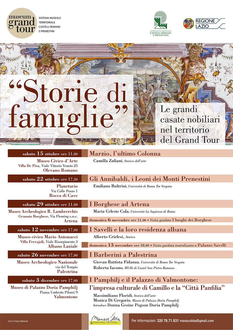 Questo ciclo di conferenze toccherà la famiglia Colonna, quella degli Annibaldi, dei Borghese, dei Savelli, dei Barberini e dei Pamphilj. Con storici dell’arte, professori delle Università La Sapienza e Tor Vergata, direttori dei Musei e amministratori, si andranno a toccare le vicende che approfondiranno i principali esponenti di ciascuna casata, alle loro committenze artistiche e al rapporto instaurato nei secoli con il territorio.