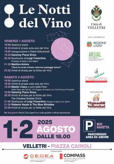 Sabato 2 agosto si replica con gli stand aperti dalle 18 e animazione itinerante fin dalle 18.30. Alle 18.30 è prevista la Master Class Fisar con lo chef Doriano Perciballi, “Dalla Vigna alla Tavola”. La musica riprenderà alle 19 con il Dancing Piano Show, mentre gli artisti di strada e The Greatest Bubble Show coloreranno la serata dalle 20.30. Alle 21 in scena Luigi Fiorentino, seguito alle 21.30 dal concerto di Roberta Vaudo & The Blue Whistles. Per entrambe le serate, saranno aperti i Musei Civici con visite guidate e laboratori per grandi e piccoli. Un appuntamento imperdibile per vivere Velletri tra sapori, cultura e spettacolo.