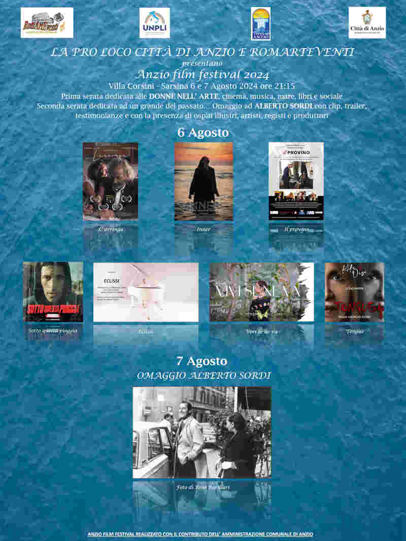 Come spiegato infatti la seconda edizione di Anzio Film Festival è organizzato dalla Pro Loco di Anzio con l’associazione culturale Romarteventi, direttore artistico Francesca Piggianelli, una rassegna dedicata alle donne nell’arte-cinema, musica, libri, sociale, la seconda serata dedicata ad un grande del passato: Alberto Sordi.