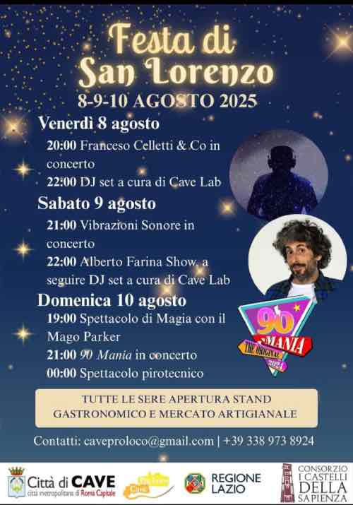 La magia dell’estate si accende a Cave, dove la festa del Patrono incontra l’allegria degli spettacoli ed illumina il grande parco della bella Villa Clementi Dall’ 8 al 10 agosto, il Parco Naturale di Villa Clementi accoglie la Festa di San Lorenzo, un appuntamento che unisce devozione, comunità e divertimento sotto un’unica stella. E così le notti di agosto si colorano del calore della tradizione popolare: il grande giardino pubblico diventa il palcoscenico dove la devozione diventa festa, le stelle scendono a sfiorare i volti e l’allegria contagia ogni angolo. Per tre sere del week-end la cittadina si ritrova a condividere serate al fresco tra musica, sorrisi, sapori e la comicità autentica di Alberto Farina.