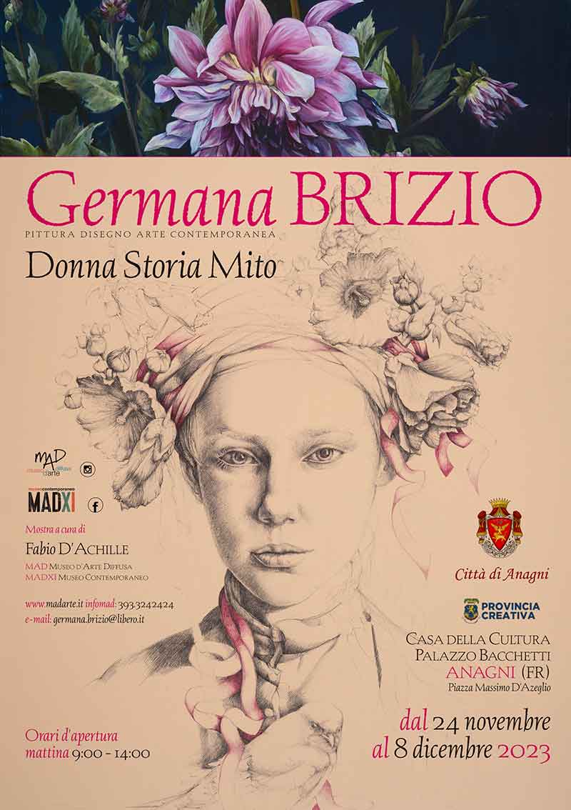 Si intitola “Donna Storia Mito” la mostra personale che raccoglie le opere dell’artista Germana Brizio nell’esposizione che sarà inaugurata il 24 novembre 2023 ad Anagni, in provincia di Frosinone e proseguirà fino all’8 dicembre.
