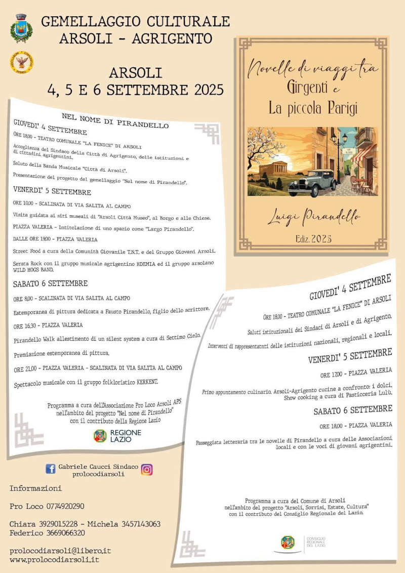 Nel cuore verde della Valle dell’Aniene, dove le montagne sembrano custodire storie antiche e i vicoli parlano con voce di pietra, Arsoli si prepara a vivere tre giorni intensi di festa, cultura e memoria condivisa. Dal 4 al 6 settembre 2025, il piccolo borgo — da sempre soprannominato “la Piccola Parigi” per il suo fermento artistico e culturale — stringe idealmente la mano alla maestosa Agrigento, città dei templi e terra natia del premio Nobel Luigi Pirandello. Nell’arco di tre giornate Arsoli celebrerà il legame speciale con Agrigento “Nel nome di Pirandello”, tra teatro, arte, sapori e poesia.