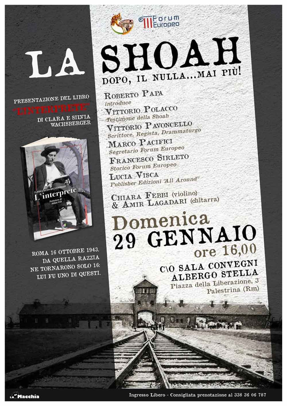 Domenica 29 gennaio, dalle ore 16:00, presso la sala convegni dell’Albergo Stella di Palestrina si terrà il convegno, aperto a tutti ed intitolato: “La Shoah. Dopo, il nulla…Mai più” organizzato dal Circolo Culturale Roberto Simeoni gli organizzatori presentano come di seguito riportato l’iniziativa: