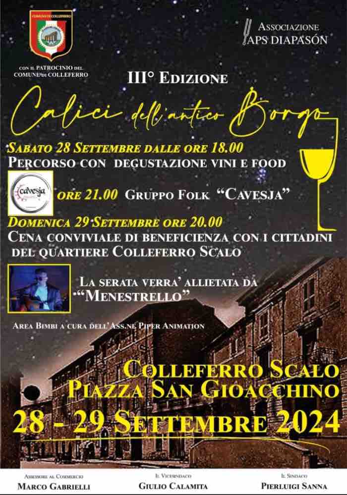Il 28 settembre 2024, Colleferro Scalo sarà teatro della terza edizione di “Calici dell’Antico Borgo”, una manifestazione dedicata alle eccellenze vitivinicole locali. L’evento, che ha già riscosso grande successo nelle precedenti edizioni, si svolgerà a partire dalle ore 18:00 presso Piazza San Gioacchino, nel cuore dello Scalo colleferrino, la zona storica da cui l’abitato di Colleferro ha avuto origine.