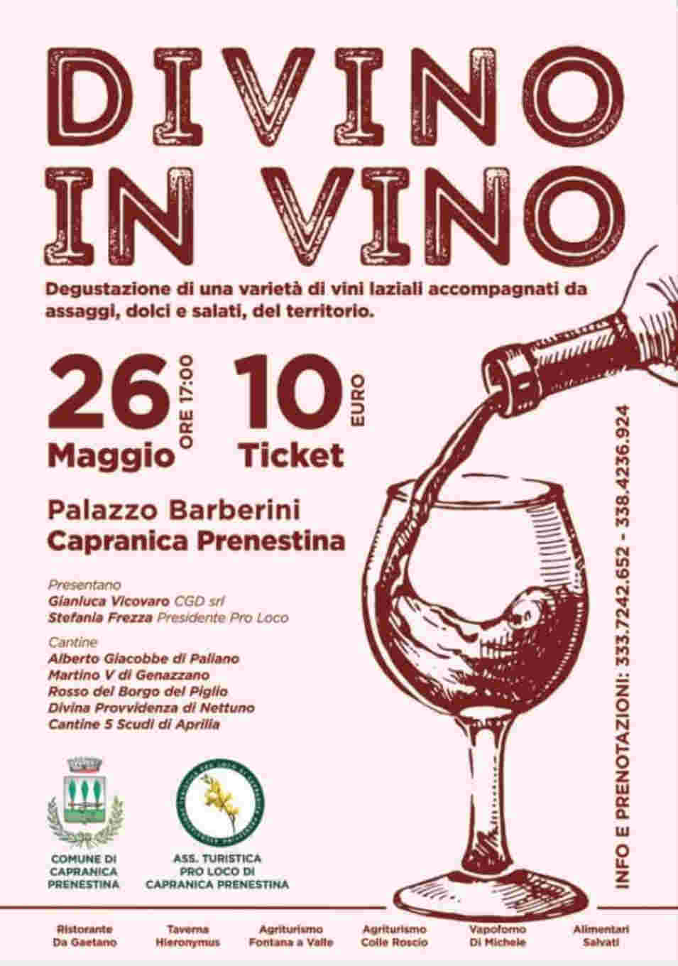 Domenica 26 maggio alle ore 17:00, Capranica Prenestina si prepara ad accogliere un evento unico nel suo genere: “Divino in vino”. Protagonista il re indiscusso delle tavole: il vino. La ghiotta occasione offrirà la degustazione di una varietà di vini laziali, accompagnati da deliziosi assaggi di prodotti locali, dolci e salati. L’evento inoltre segna l’inizio delle attività della nuova associazione turistica Pro Loco di Capranica Prenestina. Un’occasione speciale per scoprire le eccellenze enogastronomiche del territorio e per intervistare la Presidente della Pro Loco Stefania Frezza che esordisce sottolineando:
