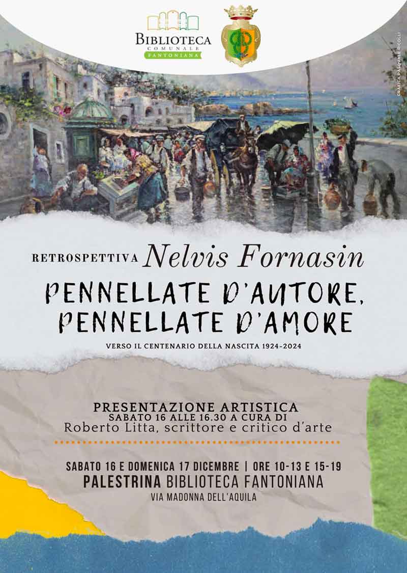 Si terrà nella Biblioteca Comunale Fantoniana di Palestrina alle ore 16:30 l’inaugurazione della mostra “Pennellate d’autore, Pennellate d’amore”, dedicata a Nelvis Fornasin, medico ed artista esponente della grande scuola paesaggistica partenopea.