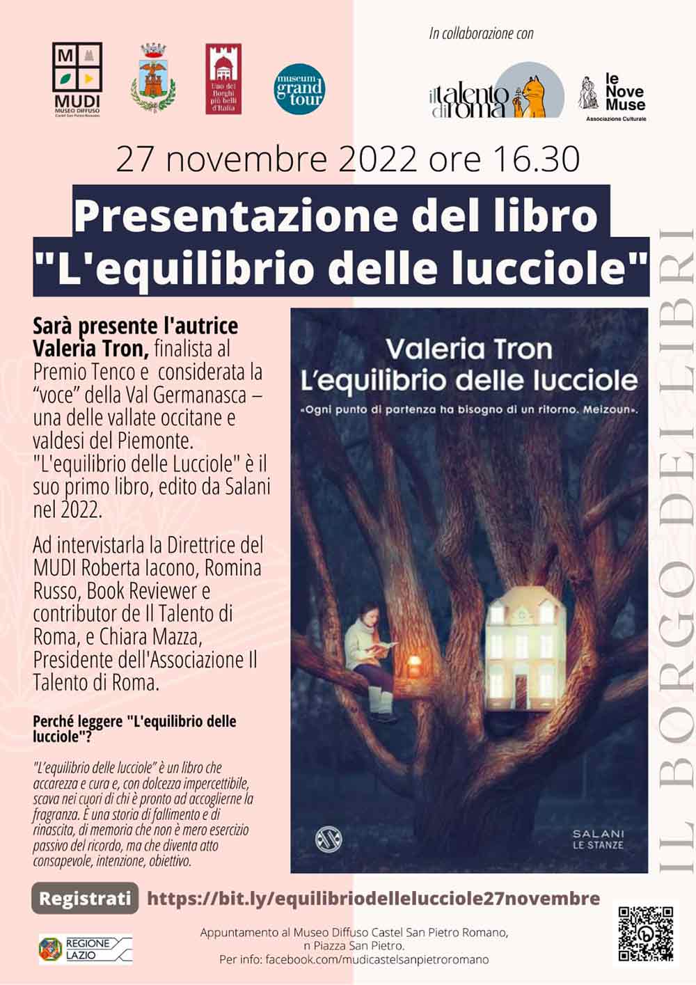 Domenica 27 novembre 2022, dalle ore 16.30, a Palazzo Mocci si svolgerà la presentazione del libro scritto da Valeria Tron ed intitolato “L’equilibrio delle lucciole”, edito da Salani nel 2022. La pubblicazione segna il debutto alla scrittura dell’autrice finalista al ‘Premio Tenco’ e considerata la ‘voce’ della Val Germanasca tra la vallate occitane e valdesi del Piemonte. Il libro è dedicato ad una rivoluzione personale gentile. Attraverso le pagine del testo si viaggia alla scoperta di quel movimento che ci riporta a chiudere il cerchio simbolico della memoria “che non è un esercizio passivo del ricordo” – sottolinea l’autrice Tron, anzi, al contrario “atto consapevole, intenzione, obiettivo”che segue la linea suggestiva della citazione contenuta nel sottotitolo: “Ogni punto di partenza ha bisogno di un ritorno. Meizoun”. La lettura si propone con un tono delicato che“accarezza e cura, con dolcezza impercettibile, scava nei cuori di chi è pronto ad accoglierne la fragranza”.